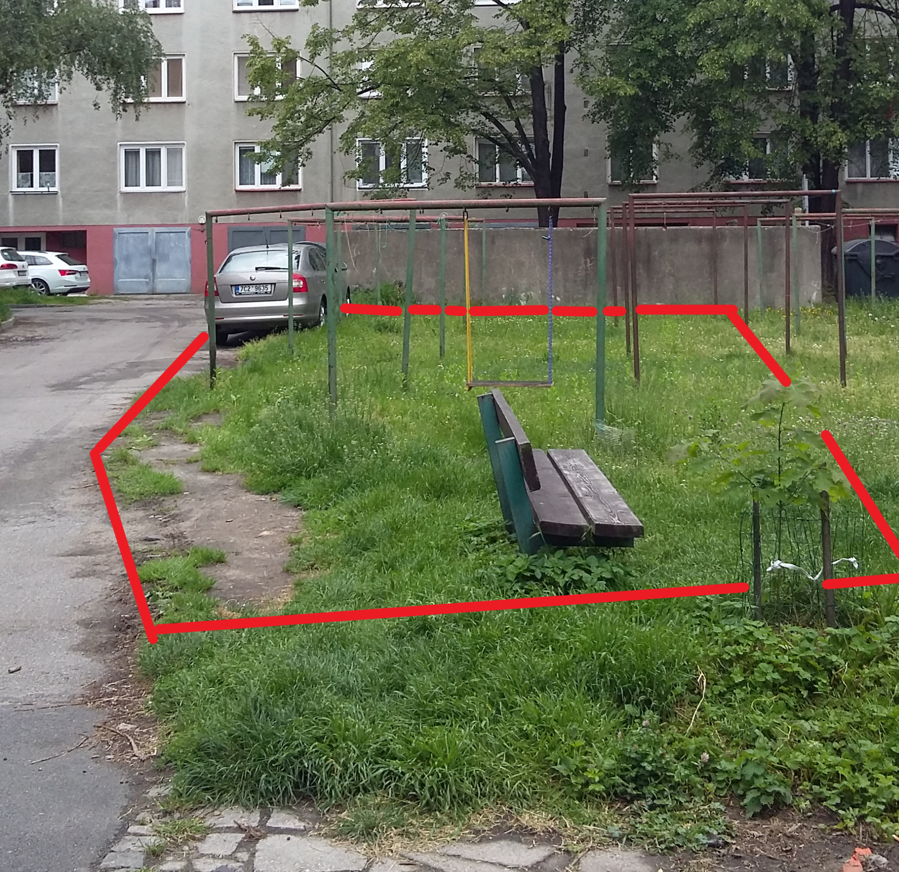 Na městský pozemek, který jsem si pomyslně rozdělil na tři menší části navrhuji umístit v první části na zpevněnou plochu posezení do kruhu s možností přinesení si vlastního grilu a jeho umístění do středu sezení. Je to část pro setkávání. Vedle tohoto plácku bude v druhé a třetí části skromnější dětské hřiště a pískoviště pro děti, aby si zde našli vyžití jak dospělí tak i ti mladší z nás. Pro rodiče dětí tu bude u hřišť další možnost posezení. V projektu myslím i na cyklisty pro které budou na místě k dispozici stojany pro kola.