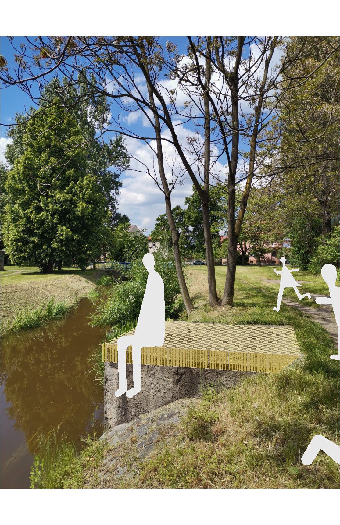 Hojně využívaná pěší cesta podél Mlýnského náhonu směrem k Velkému jezu je po dešti plná kaluží a svou kvalitou neodpovídá intenzitě využití. Jako místní obyvatelé máme zájem o její obnovu a pravidelnou údržbu. Krásné říční prostředí přímo vybízí k doplnění ploch k sezení v podobě jednoduchých dřevěných konstrukcí umístěných na technologických betonových objektech sousedících se stokou, mol pro malé rybáře a dřevěných prvků k sezení na hraně břehu a volného prostranství bývalého hřiště "Regule". Navrhujeme doplnění stromů jak chybějících tak nových, aby podél toku vznikla souvislá alej. Průběh nové cesty by měl vycházet ze stopy nynější pěšiny. Přírodní materiálové řešení cesty mlatovým povrchem a jednotlivých dřevěných prvků by mělo být v souladu s připravovanými obnovami parků, které s projektem sousedí a které inspirovaly tento návrh (park Polní, Mánesova x Čechova).
