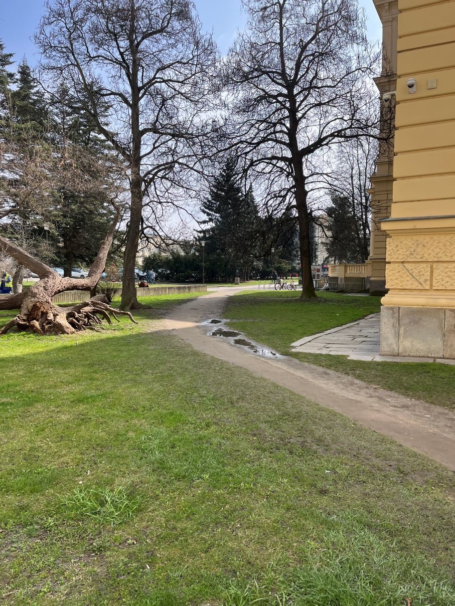 U Jihočeského muzea na straně od parkoviště si chodci odjakživa zkracují cestu šikmo na křižovatku Dukelská a Jirsíkova. Prosím o zvážení, zda by v místě vyšlapané pěšiny nebylo možné zřídit alespoň úzký zpevněný chodníček či vysypanou mlatovou cestu, která by zajistila průchod kolem muzea směrem do města.