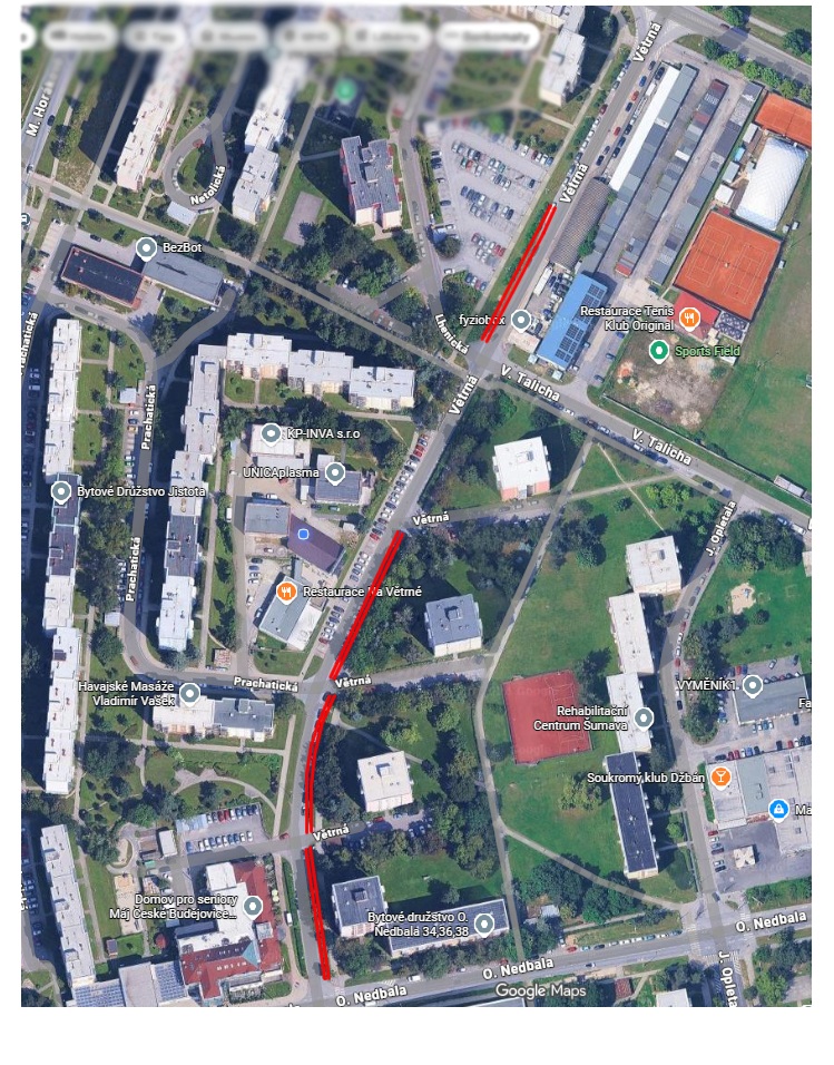 Ve Větrné je Domov důchodců, zdravotnické zařízení na odběr krevní plazmy a několik dalších firem, které zaměstnávají budějovické občany a jsou závislé na příjezdu i velkých nákladních vozidel. Aby se předešlo komplikacím v provozu a Větrná ulice se opět stala obousměrnou, navrhuji zrušení části travní plochy mezi cestou a chodníkem alespoň v šířce vozidel, které zde nyní parkují, a její nahrazení parkovací plochou ze zámkové dlažby pro případnou snadnou přístupnost inženýrských sítí. V prostoru mezi touto parkovací plochou a chodníkem vysadit, místo stávajícího řadového keřového porostu, stromy typu javor, které tvoří korunu v určité výšce a navazovaly by na stávající parkovou zeleň. Tyto mohou sloužit jako celkové přistínění prostoru a hlavně jako další "zelený" prvek.