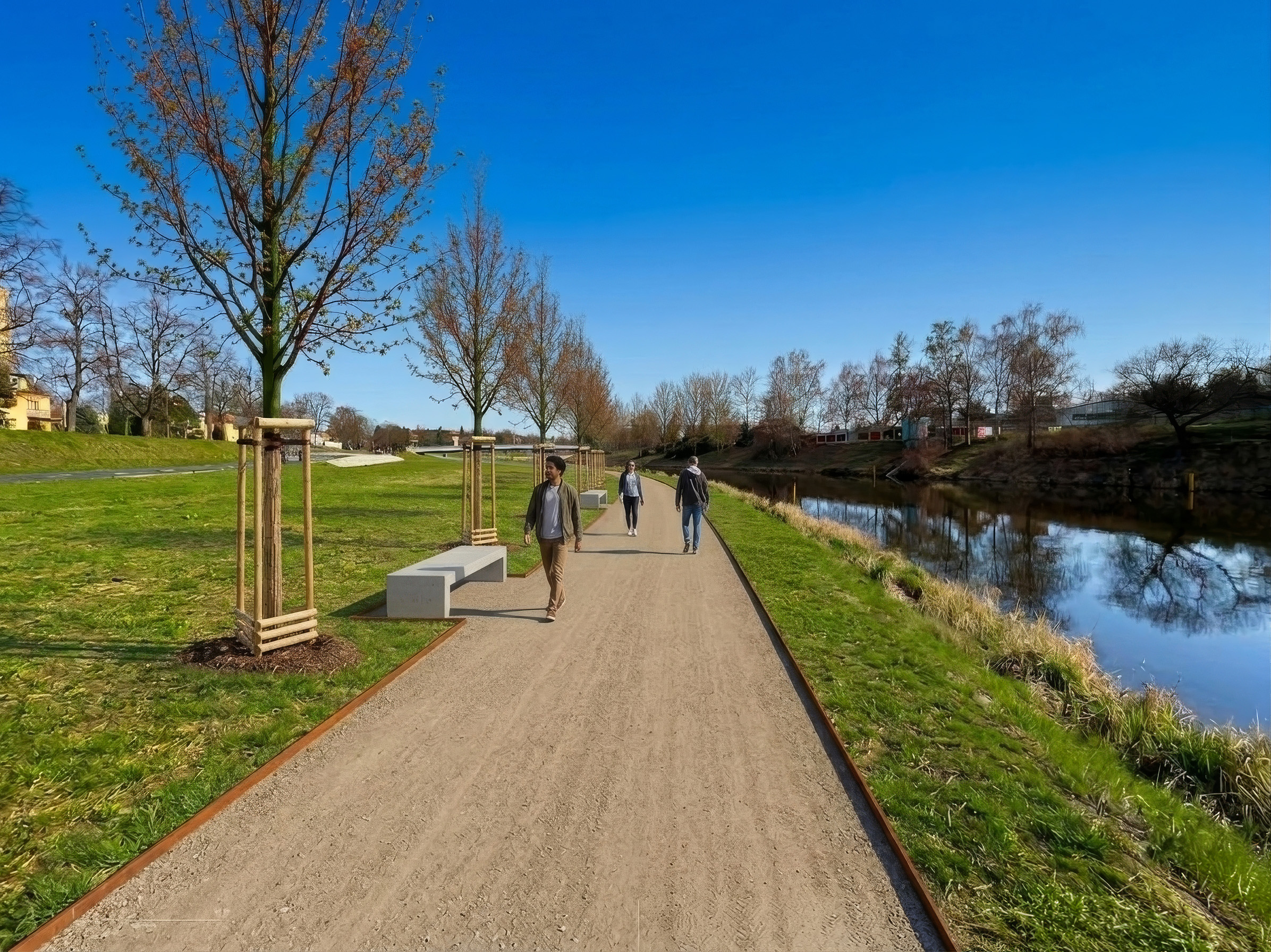Navržená trasa vede v úseku od Slunečních ostrovů až k přístavišti v celkové délce přibližně 320 metrů. Hlavním přínosem je přímý kontakt s vodou, který stávající chodník situovaný až nad úrovní cyklostezky neumožňuje. Nová stezka o šířce 1500 mm bude provedena z přírodního mlatu s nenápadnými ocelovými obrubami, čímž se nábřeží zpřístupní pro aktivní využívání. Součástí návrhu je výsadba vzrostlých listnatých stromů, které prostor vizuálně zútulní. Komfort pro návštěvníky zajistí celkem 6 laviček s odolnou konstrukcí a kotvením, které jsou vhodné do náročnějšího terénu u vody, což vytvoří ideální podmínky pro odpočinek v těsném sousedství řeky.