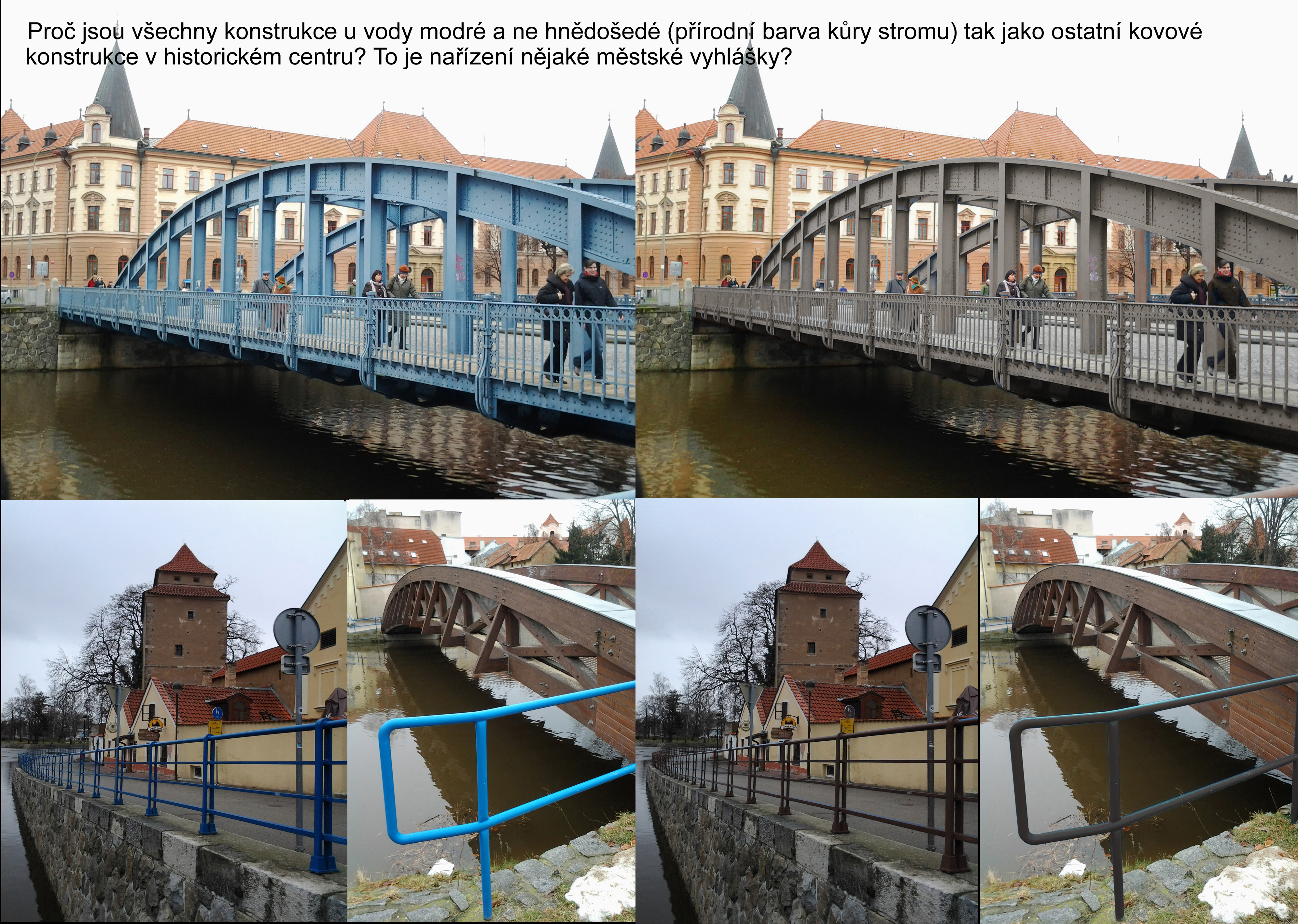 Cílem projektu je přetření stávajícího kovového zábradlí v lokalitě Slepého ramene a podél Malše. Současná modrá barva je vizuálně zastaralá a neodpovídá přirozenému charakteru okolního prostředí. Navrhuji změnu odstínu na „kovářskou čerň“, případně tmavě šedou matnou barvu (práškovou). Tato úprava dodá centru města modernější a elegantnější vzhled, který lépe koresponduje s historickým jádrem i barvou vodní hladiny.