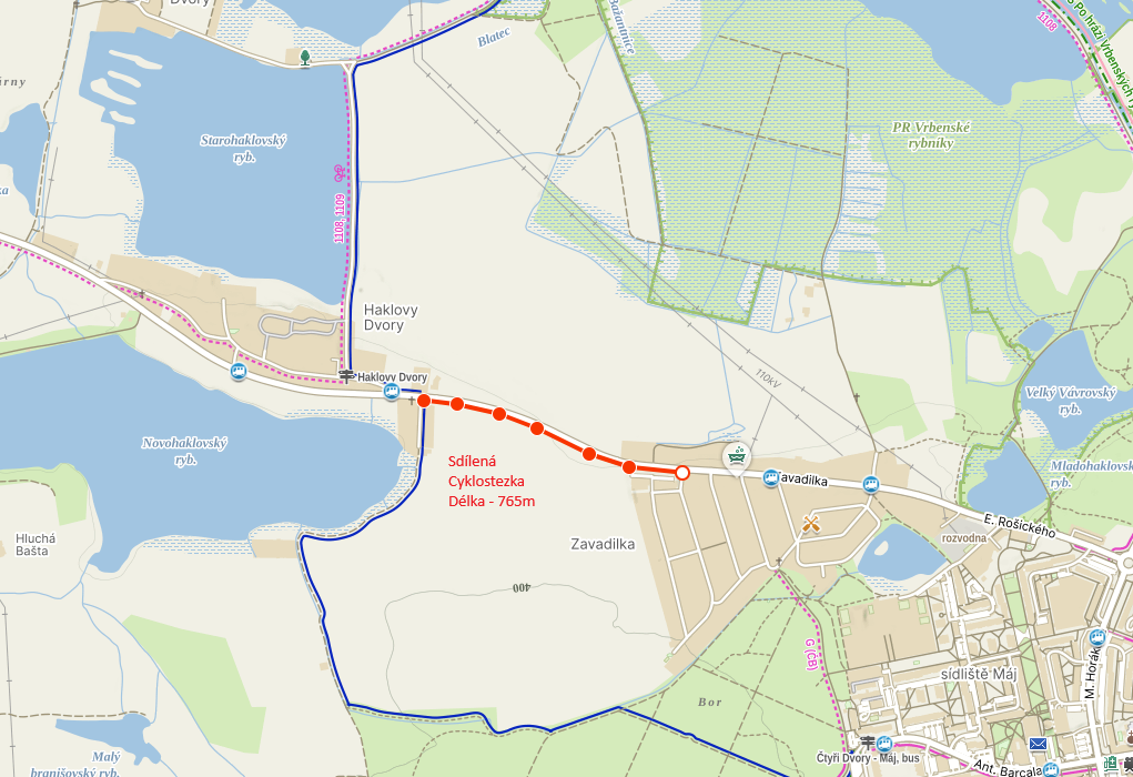 Cyklostezka, která spojuje Zavadilku a Haklovy Dvory (Vrbenské rybníky). Jedná se zhruba o 1 km nové cyklostezky, která by ovšem velice pomohla starostem občanů obou míst. Nyní se zde nachází pouze nebezpečná hlavní silnice pro motorová vozidla. Pokud by chtěl jít chodec mezi těmito kilometr vzdálenými místy, musí se buď ohrozit a jít po silnice nebo se vydat oklikou přes Branišovský les. Jedná se v mém projektu o sdílenou cyklostezku pro cyklisty a chodce. Na Zavadilce se již cyklostezka nachází, vede ovšem na konci Zavadilky do "nikam". Přitom pokračovaní cyklostezky do Haklových Dvorů, by znamenalo pro celé České Budějovice rozšíření schémat cyklostezek, jelikož ze Zavadilky vede cyklostezka na páteřní cyklostezku kolem Vltavy. Dalším plusem by bylo zatraktivnění daného místo, jelikož z Haklových Dvorů se velice jednoduše dostaneme k Vrbenským rybníkům. Ideální pro procházky, či sport.